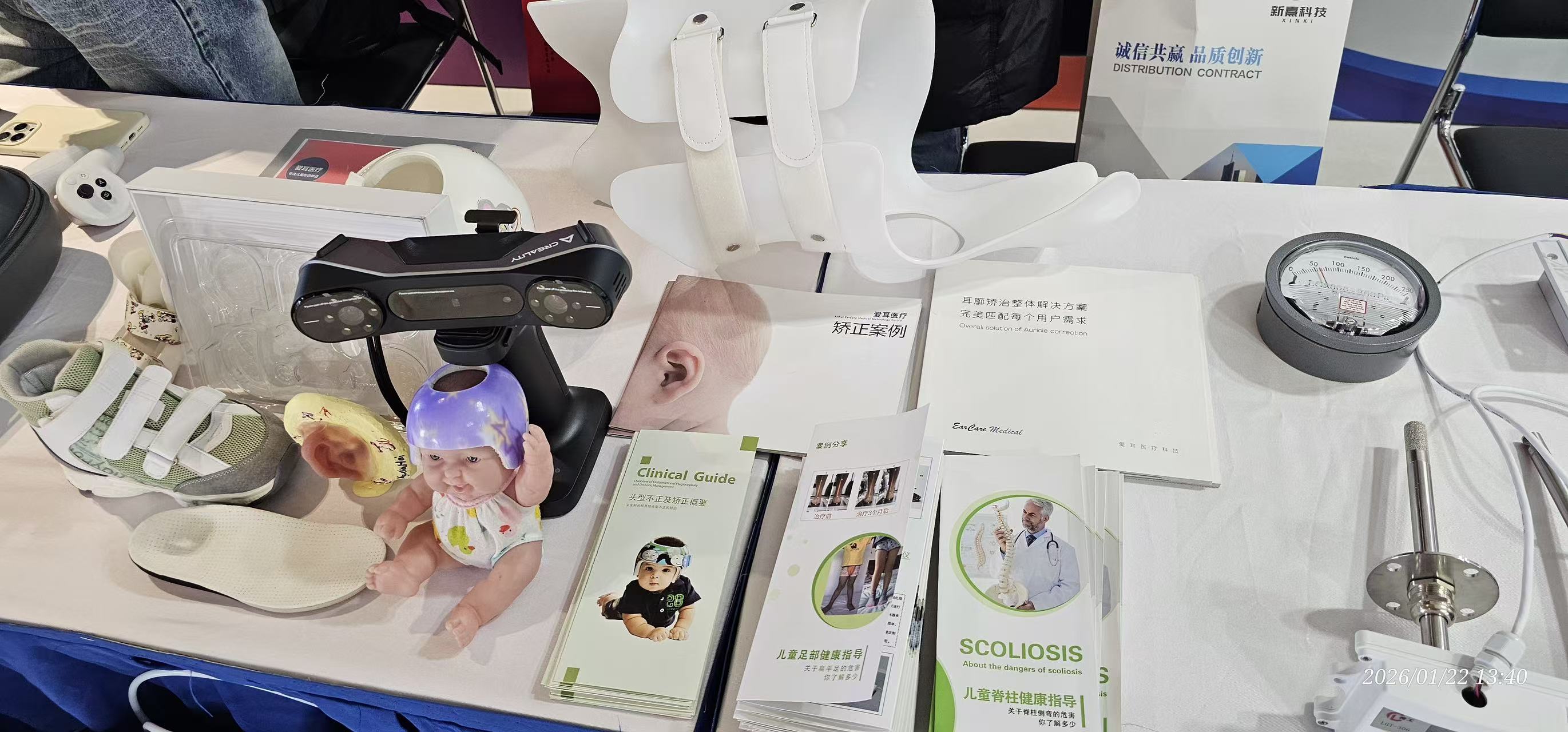本次峰会聚焦 “人工智能 + 场景服务” 的价值落地,爱耳医疗在现场设置专属展位,重点展示了婴幼儿头型矫正、耳廓畸形矫正、脊柱侧弯干预及扁平足矫正四大核心业务板块。展位上,3D 扫描设备、定制化矫正器具、临床案例手册等吸引了众多参会者驻足咨询,直观呈现了爱耳医疗在儿童形体健康领域的技术积累与服务能力,不少嘉宾对非侵入性矫正方案表现出浓厚兴趣。